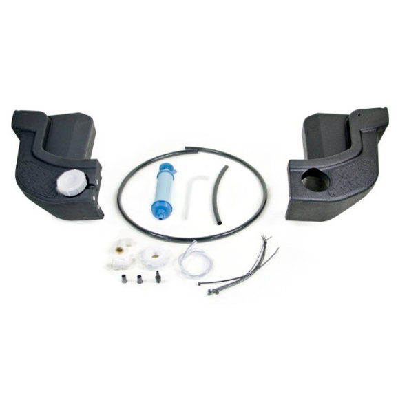 So, you've purchased a Moab or Call of Duty® Wrangler and you'd like to have the water carrying capabilities of the AEV Rear Bumper. Well, here's the product for you. The Rear Bumper Water Tanks with Pump Kit gives you 2 replacement rear corners as well as the AEV Pump Kit that allows you to plumb them together to give you 5 gallons of water storage right in your bumper.