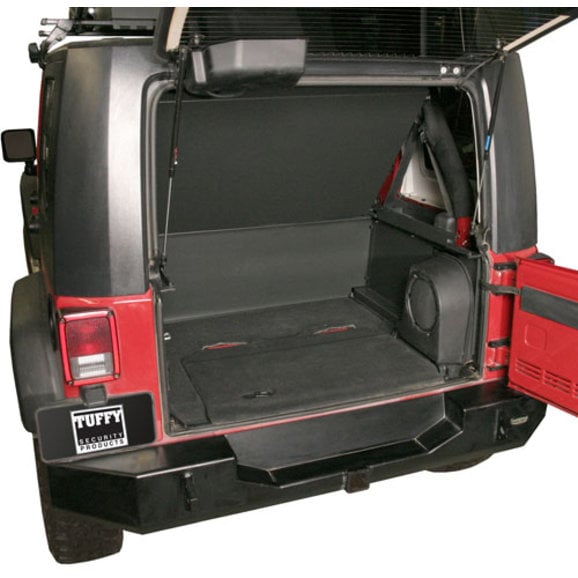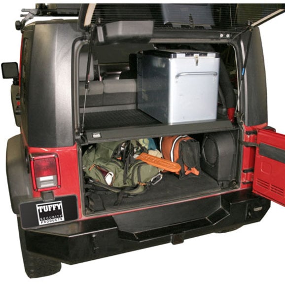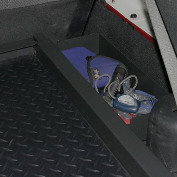 It will work in vehicles equipped with or without the subwoofer and functions with the OEM compartment cover or the Tuffy Cubby Cover Part # 143. All trays have external drain holes to prevent puddling moisture. Mounts easily without drilling in two and four door models and works with an OEM hard or soft top. Optional Rubber mat part # 864 shown in some images is not included but can be ordered separately.