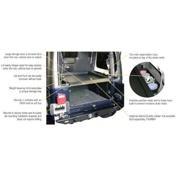 All trays have external drain holes to prevent puddling moisture. Mounts easily without drilling in TJs and LJs. Mounts easily in YJs to factory holes with optional drilling. Works with an OEM hard or soft top.