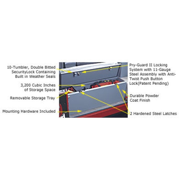 The security storage trunk is a great way to store valuables in your Jeep. Fits neatly between the rear wheel wells and behind the rear seat. Pry-Guard construction and tough continuous hinge provide outstanding security. Grade 8 installation hardware is standard included. Durable epoxy wrinkle finish available in black, gray, charcoal or spice. Two pick-proof tubular locks are provided.