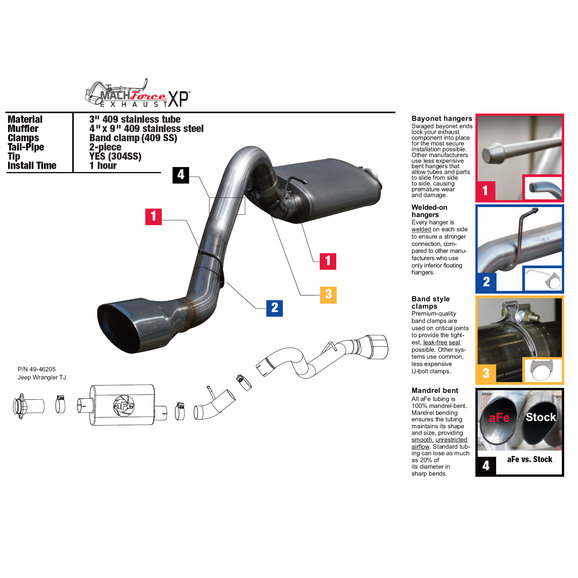 aFe exhaust systems are manufactured in-house to the highest engineering standards for performance and quality. All tubing is 100% mandrel-bent to provide the highest flow possible. Each system is extensively dyno and flow bench tested to provide maximum gains for your Jeep®. This new exhaust system for the 97 to 06 Wrangler TJ using a special flange adapter and picks up 5hp and 9 lbs. x ft of torque and installs in less than an hour.