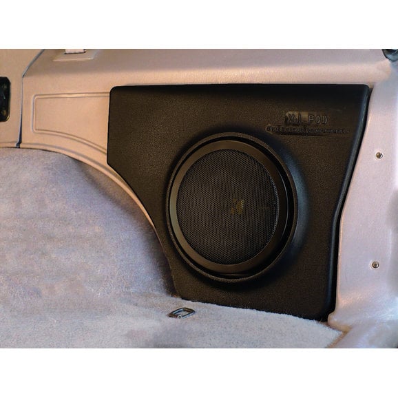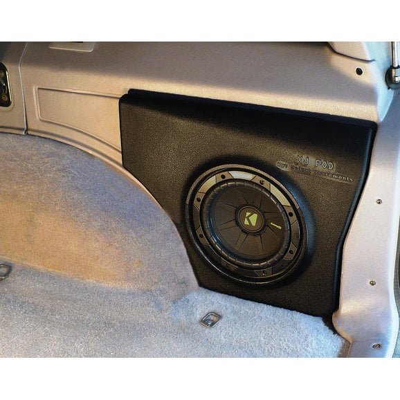 The XJ Pod is constructed of sturdy, textured plastic and provides a neat, factory appearance without using up any cargo space! The XJ Pod boasts a sealed-chamber that delivers tight mid and low-end audio response in an idea .4 cubic feet of volume. A concealed wire-lead hole at the base allows for a tidy installation. The XJ Pod comes with an 8" Kicker sub woofer, utilizing a polypropylene cone to withstand the elements and rated at a true 200 watts