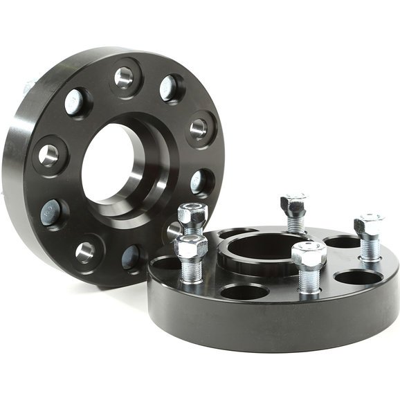 This pair of 1.25 inch wheel spacers from Rugged Ridge fit a 5 x 5-inch bolt pattern. These hub centric spacers move your wheels out to help fit wider tires and give your Jeep a wider track and improved stability. Constructed of double anodized black extra thick 6061T6 aluminum for long life and extra corrosion resistance. All hardware is grade-8 for extra strength.