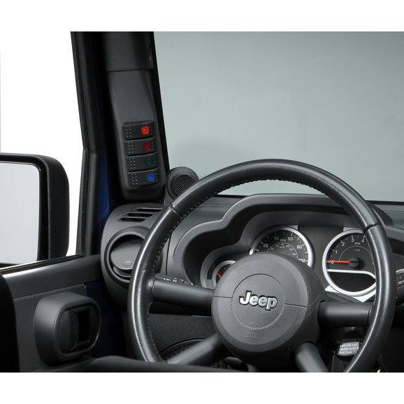 The Rugged Ridge A-Pillar Switch Pod for Wrangler JK has premolded cut outs allowing, up to four, rocker switches (sold separately). Mounting auxiliary switches up and out of the way from the dash and shifter allows for easy reach and use. Textured black finish to match your vehicles interior for the ultimate look. This fits the left side A pillar (Drivers side of a US vehicle or Passenger side of a British vehicle).