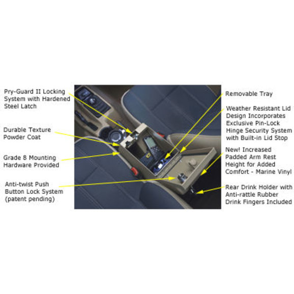 This 16-gauge steel console is specifically designed for use in the Jeep Wrangler TJ with the full factory console and factory sub-woofer. This console is designed to protect the expensive OEM sub-woofer and provide lockable storage for other valuables. The new sleek, custom fit design matches the TJ's refined interior and offers 2 ½ times more storage than the factory console.An 8" aftermarket speaker can be installed behind the 6 ½" cut-out.*Speaker not included.*Replaces rear half of original console.*The original front console for shifter is still used.Exterior Dimensions:21"L, 8 ½"W, 17"H3 ½" Holes for drinks.Interior Dimensions:11"L, 6 ½"W, 5 ¼"HCutout for CDs 7"L, 4 ½"W, 5 ¾"H(Length is tapered, some interior space lost to parking brake)