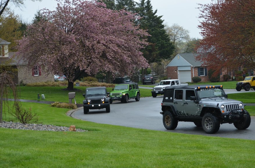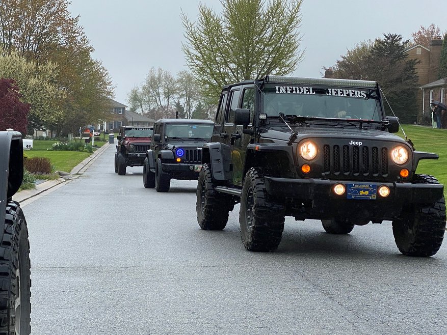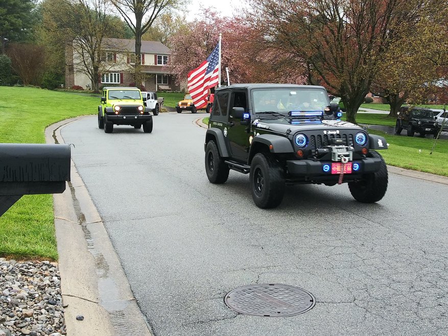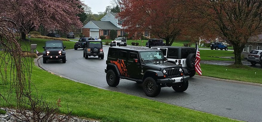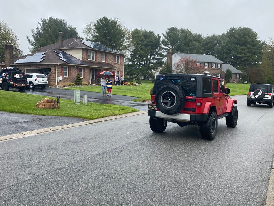 As the caravan rolled on and vehicles passed Cummings and family, it looped around a circle in the neighborhood and then filed past the house again—Jeeps passing each other at that point.