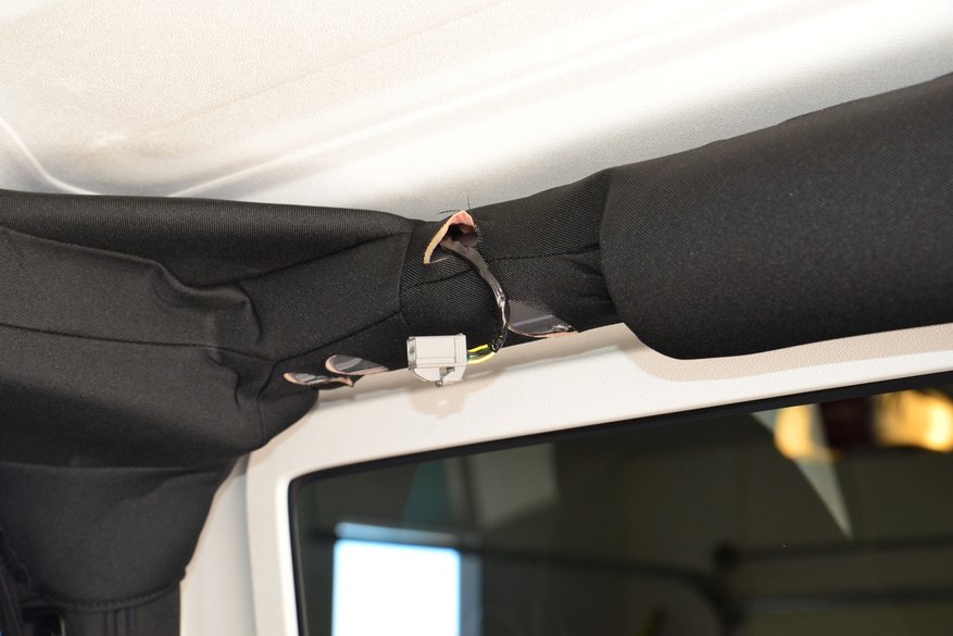 The Mopar Wrangler headliner comes with six panels for the Wrangler 2-door. The short adhesive strips shown in this Mopar photo have been changed to long strips for easier installation.