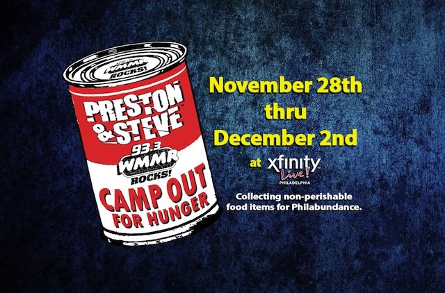 The Preston and Steve Camp Out For Hunger food drive is scheduled November 28-December 2 at the Xfinity Live! Complex in South Philadelphia.