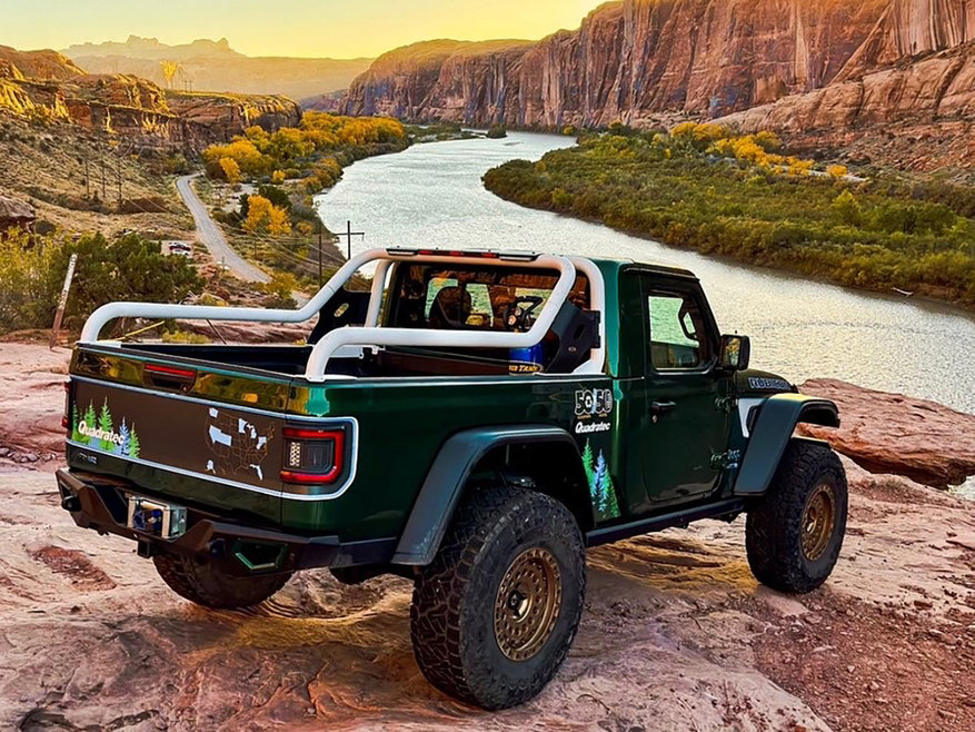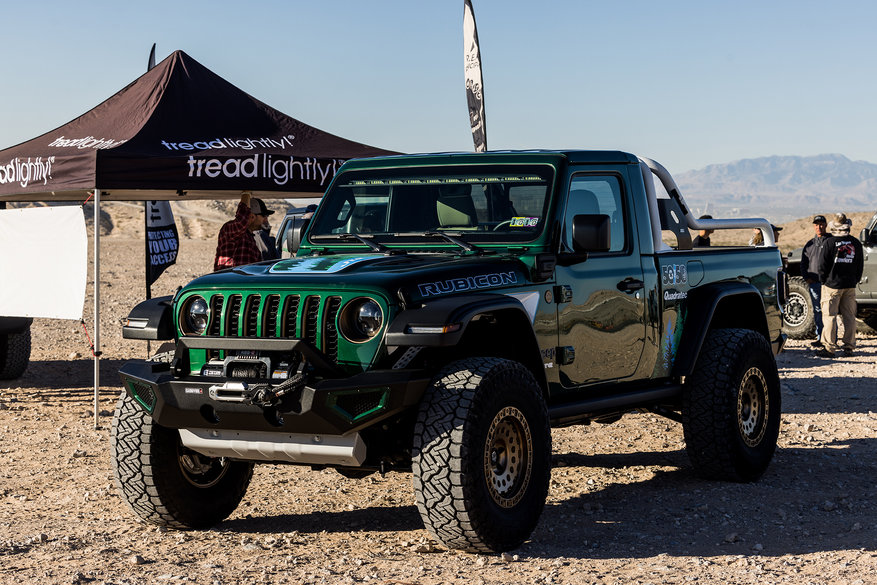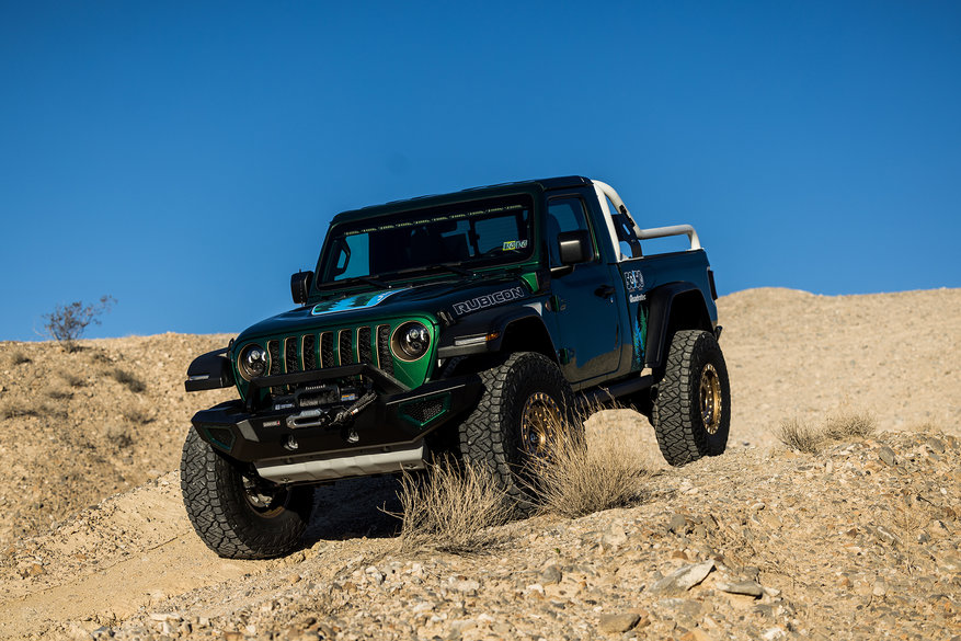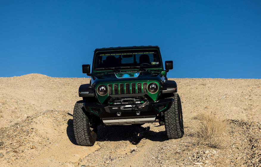 The result is a Wrangler-sized wheelbase with a truck bed a little over 10 inches longer than a traditional Gladiator, perfectly sized to carry trash and other debris from the coming trail events. It is clad in a custom, sparkling green paint design that includes a few of Henderson’s own drinking glasses that were crushed up and mixed in with that paint.