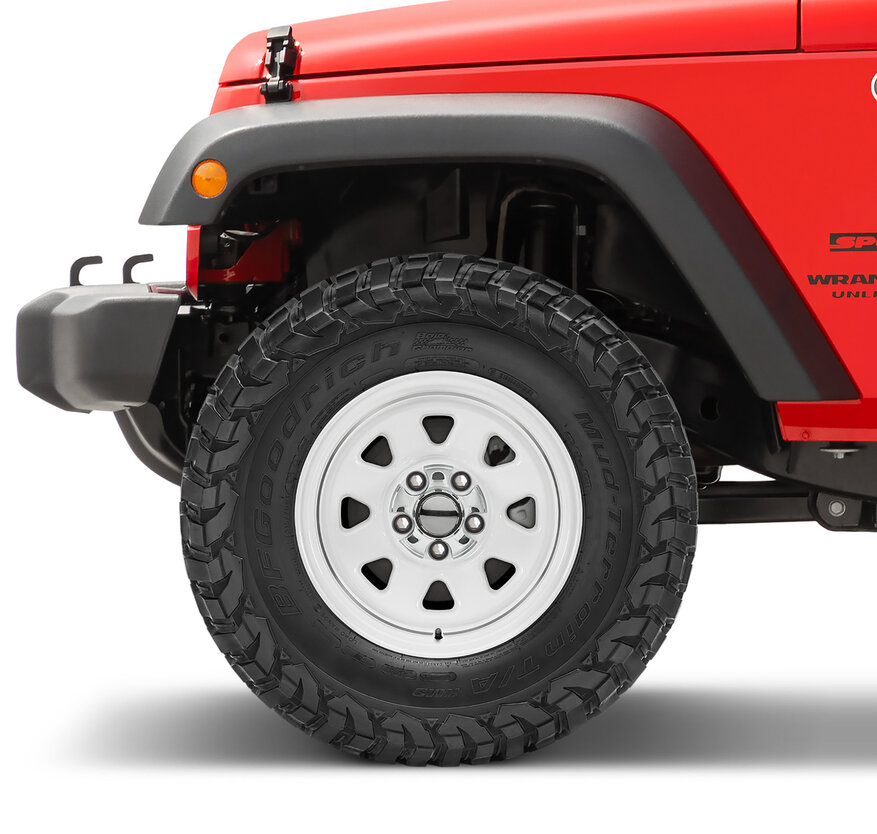Originally inspired by the factory wheels on Renegade and Laredo CJs of the ’70s and ’80s, these wheels bring that heritage look into the modern era with a pressure-cast aluminum body, raised machined pinstripe, and removable center-cap design. The 17″ × 8.5″ version for Wranglers and Gladiators features 5.2″ backspacing, is hub-centric, and saves roughly one-third the weight of comparable steel wheels.