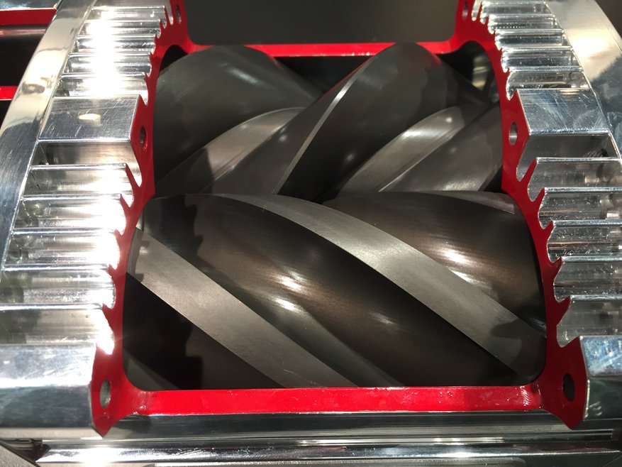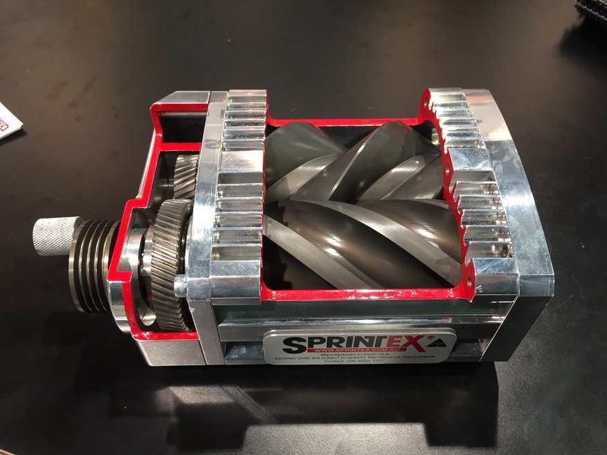 Sprintex, an automotive engineering company based in Perth, Western Australia, is known worldwide as one of the few companies to produce a twin helical screw type supercharger. Their unique patented design is a mechanically driven rotary compressor with two helical lobed rotors, which rotate in opposite directions. One rotor takes the form of the left-hand helix, the other the right hand helix and the two mesh together to form chambers which carry the air. The rotors never touch, but are timed by a pair of gears operating in a lubricated chamber which is separated from the rotor chamber.