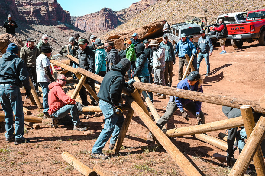 Robins, along with Tread Lightly! Master Tread Trainer Scott Ammerman, Tread Lightly!’s Anna Baklund, U.S. Bureau of Land Management Supervisory Ranger Reed Kennard and Matt Westrich, President of the Utah Four Wheel Drive Association, spent the early part of Easter Jeep Safari week ferrying project materials from town to the remote Kane Creek work site so everything would be ready for project day. This included scores of long wooden logs, signage, power tools, trash bags, gloves and plenty of hardware to connect the logs.