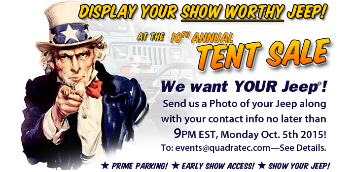 Plus this year, if you think your Jeep has what it takes, Quadratec is looking for about 50 show-worthy Jeeps to be prominently displayed at the Tent Show. Receive prime parking, early show access and be the envy of Jeep lovers show-wide. Email your contact information, as well as a picture of your Jeep, to [email protected] no later than 9PM EST, Monday, October 5th for your chance.