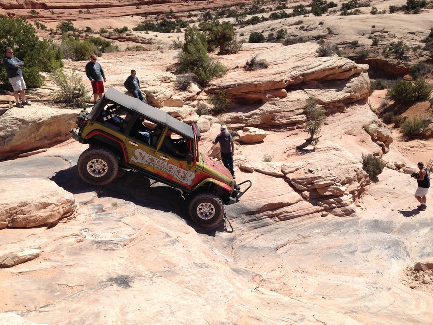 Monday of Easter Jeep Safari means it's time for the annual Skyjacker Suspension trail ride. This year we were headed out to 7 Mile Rim and Wipeout Hill for a day of fun on the trails. After a quick morning meeting we were on our way a few miles North of Moab on highway 191 to the trail head. Once everyone was aired down we set out toward Tusher Tunnel, our first destination of the day. The attraction is a natural tunnel through the the cliff that has been eroded away by water seeping through cracks in the rock over thousands of years. At close to 100 feet in length, the tunnel was high enough to easily walk through, and the view of the valley on the opposite side of the tunnel was amazing!