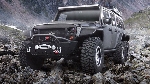 The Tomahawk is a 6x6 version of the Jeep Wrangler where an extra axle was added to the rear which makes the vehicle look similar to a Mercedes-Benz G63 AMG 6x6.