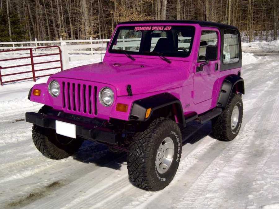 My daughters pink 1999 Jeep Wrangler Sport 4.0L. I've added a Rough Country 4" lift with Goodyear 33" x 12.5" tires with a 1 1/2" spacers and kept the original Jeep wheels. To keep some of the mud off I added the 6" fender flares from Bushmaster.