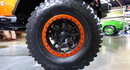 The painted, Copper Canyon-colored body pops, riding high on giant 35-inch BFG all-terrain tires paired with a two-inch lift kit. The BFGs are wrapped around functional, Jeep Performance Parts (JPP) 17-inch beadlock wheels that assist the rubber in negotiating the off-road, with custom beadlock rings painted to match the body color.