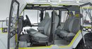 The Safari’s unique “windoors,” made of lightweight aluminum and clear vinyl, are hinged so that they open like a cabinet, making the entrance to the vehicle particularly unique. The doors feature zipper openings to let in fresh air.
