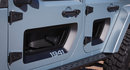 The Switchback exterior features a concept hood and half doors, topped off with a concept “Safari” hard top and roof rack system. The Switchback’s exterior also includes Jeep Performance Parts high-top fender flares, Mopar black fuel door and tail lamp guards, and Jeep Performance Parts swing gate hinge reinforcement and oversized spare tire carrier.
