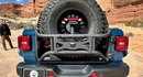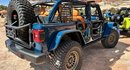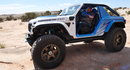 From front to back, this thing has a lot — including a new smaller seven-slot production grille, a grille guard that folds down into a seat, tubular doors opening up the cabin, slotted rock sliders and flip-over tire carrier that can place the tire inside the back bumper or above the trunk, while still maintaining the rear-facing camera. Most parts on this vehicle are either currently available for purchase, or will be ready later this year.