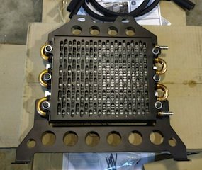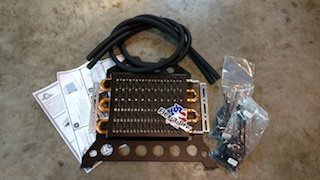 Assemble the transmission cooler as pictured using the supplied Gator Clips, 11mm bolts, nuts and washers around the upper and lower tubes, with the feet of the lower bracket facing towards you and the cooler fittings facing right. I added additional Gator Clips included in the Oil Cooler Guard kit on the middle tubes, but these aren’t actually necessary for mounting.