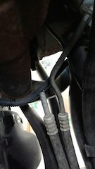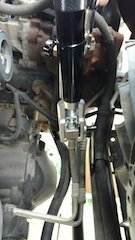 These are the lines we’re working with. The top one as it crosses over the axle is the return line. You should decide where to cut it based on the type of flaring tool you’re using.