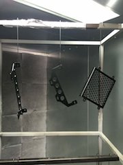 Since a hailstorm of small stones will no doubt bombard this unit at highway speeds, I opted to powder coat the stone guard and mounting brackets. A rattle can paint finish wouldn’t hold up nearly as well in the long term, and I wanted to make the complete cooler installation look less obvious. The three parts were sent to Shore Polishing and Finishing in Toms River, NJ for a quick media blast and matte black finish.
