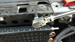 Set the cooler assembly in place, center it, and mark where your holes are to be drilled. Using that #1 drill bit, drill holes in the upper grille support and lower crossbar. Set the cooler back in place and tighten mounting bolts with a 10mm socket. These will be cutting threads in the metal as they tighten in, so make sure they’re straight. They are slotted for a flathead screwdriver as well, but I found a socket to be an easier way to cut the threads.