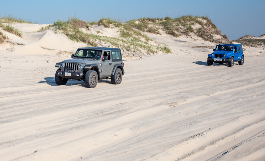 Hopefully, you already understand how to use your Jeep’s four-wheel drive system, but if not, then it is a good idea to review the differences between 4-hi and 4-low. Generally, 4-hi is better for most sand driving, but that sand can change throughout the day depending on water and wind conditions. For softer sand, 4-lo may provide more of a traction advantage. If the sand is hard packed for your entire journey, then 2-wheel-drive should be fine.
