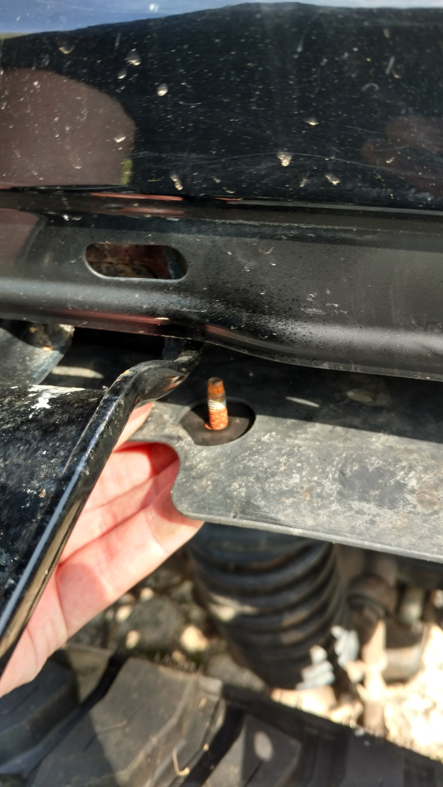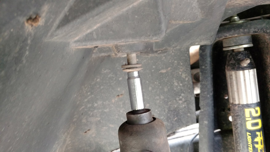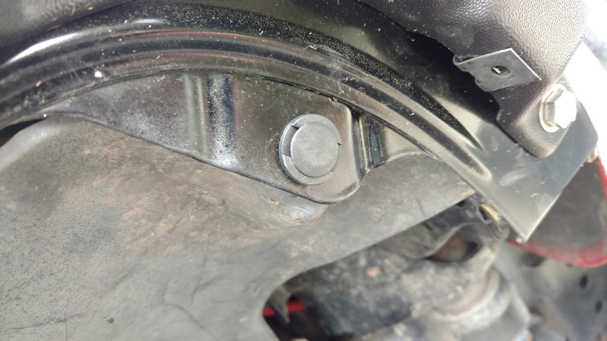 Reinstall the front fender liners with one washer and 10mm bolt removed in the earlier step, using the hole right behind the fender support bracket. These will hold the liners in place for marking.