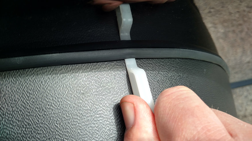 When all the fender flares are installed, check for gaps in the adhesive trim and correct them with the provided plastic tool. Slide it under the surface of the trim and press firmly to correct any spots that didn’t quite stick.