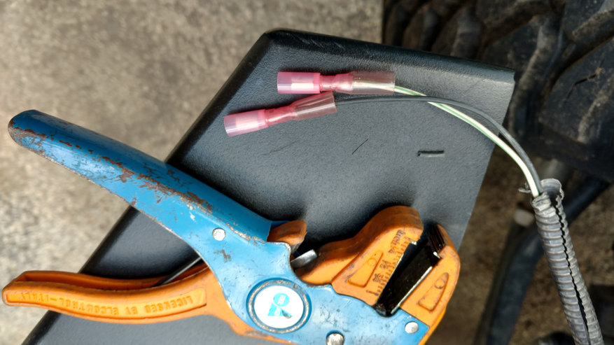 Strip the wires and attach the heat shrink bullet connectors found in the hardware kit.