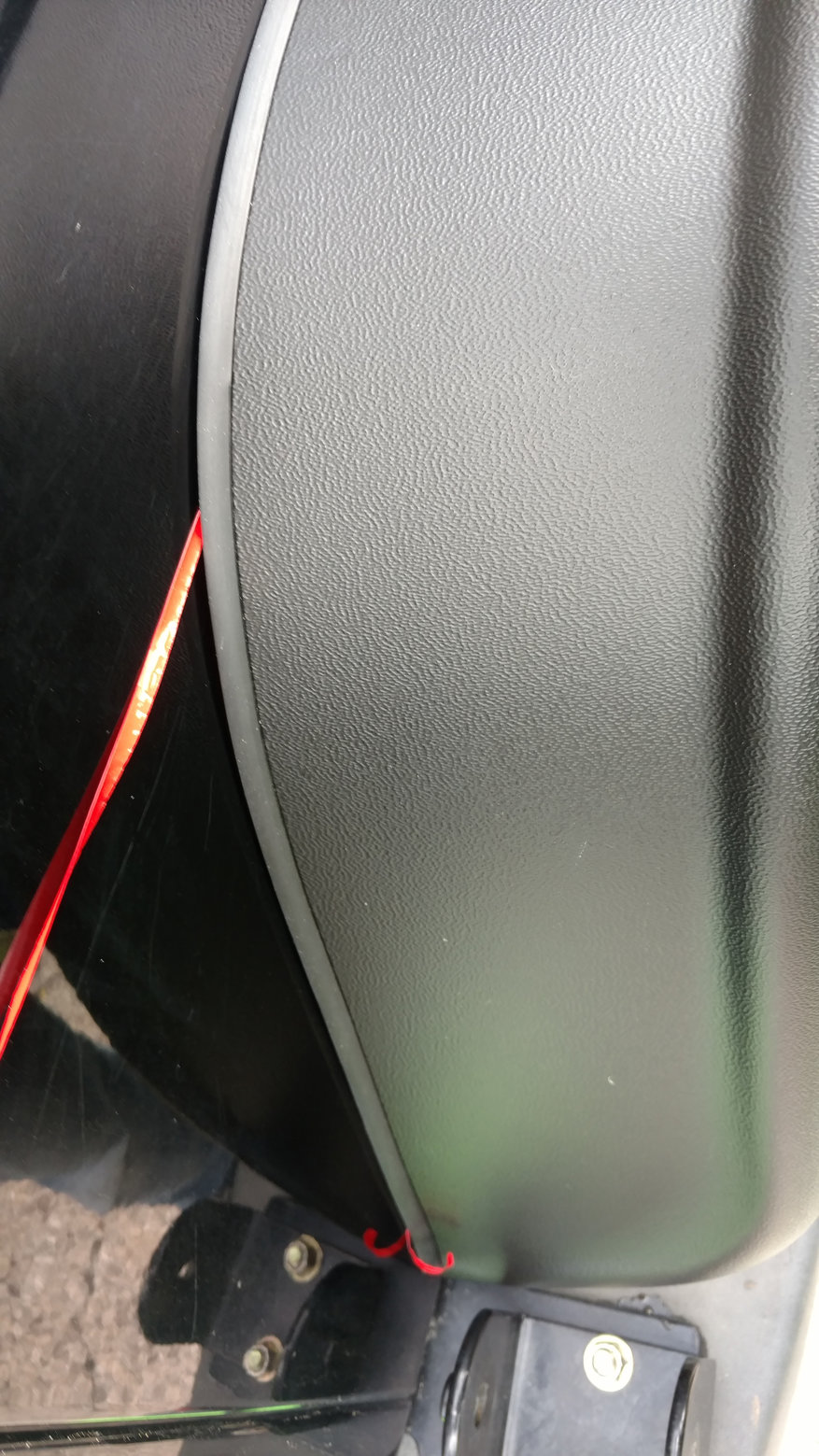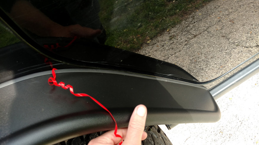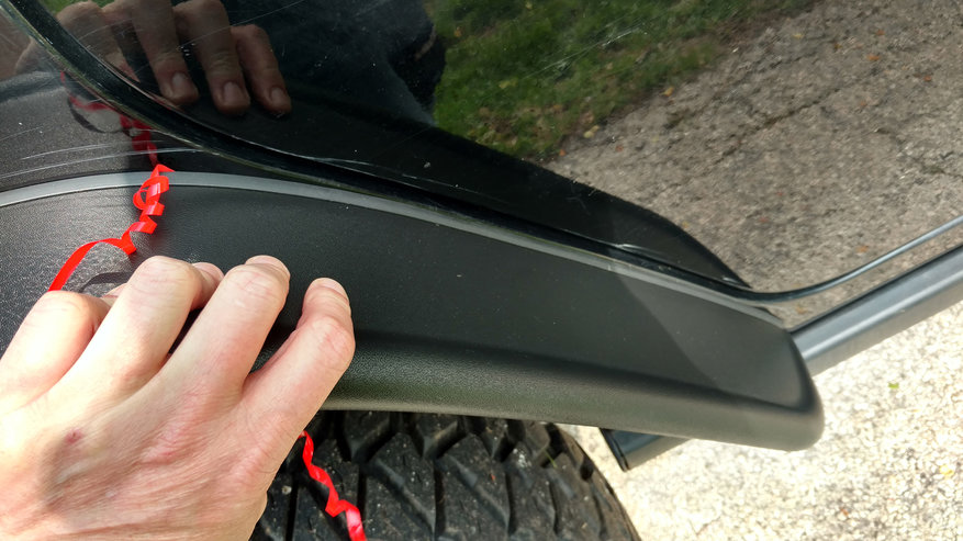 Install the edge trim on all four fender flares by slowly pulling the red tape back a few inches at a time, and pressing firmly to make sure it is fully adhered to the surface.