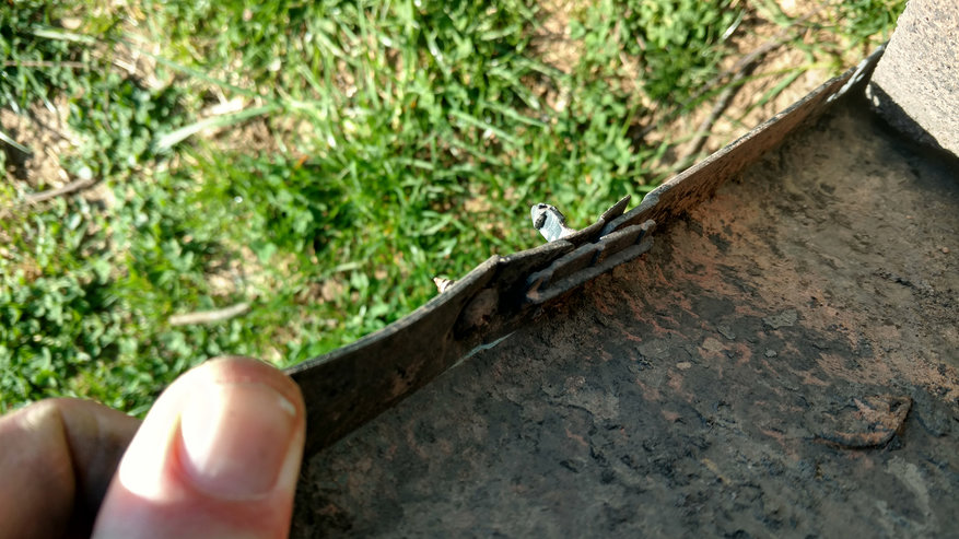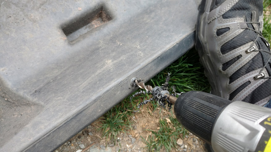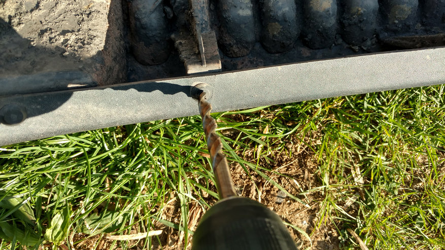 Using a drill and a 5/16” bit, drill out the center of each rivet. As you go, many of the outside rings of the rivets will get stuck on the bit - don’t bother removing these until the end.