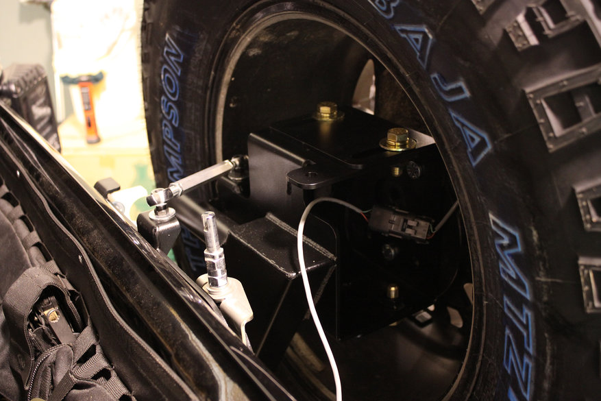 I already had my factory spare tire carrier removed, so I’m skipping a few steps here. I also relocated my third brake light and tag lights using a Rock Hard 4X4 Parts License Plate Relocation Bracket . Since everyone’s needs and current upgrades are different, no third brake light solution is included in this kit. Have no fear though, Hyline offers a super slick and low cost Oversized Spare Tire 3rd Brake Light if you don’t already have an aftermarket third brake light solution. It shines through the hub hole on your spare with a bright red LED light, without having to stick up past the tire itself.