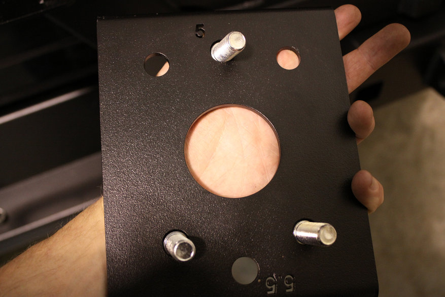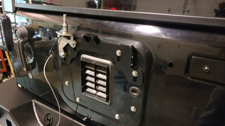 For the next step, hand thread the four 13mm bolts you removed from the factory tire carrier to install the supplied tailgate bracket. In this picture, I have a set of stainless steel bolts (M8x1.25x30mm) and washers I purchased locally for another project, as well as longer bolts for my Quadratec Stainless CB Antenna Rear Tailgate Mount being used to install the plate. Either way works, I just used what I had (since I unfortunately threw out the factory ones). I also added bolts and washers to the bottom holes because I am apparently made of money. If you have an exhauster as mentioned above, then install it now. Don’t tighten the bolts yet though, as we need them loose for final adjustment.