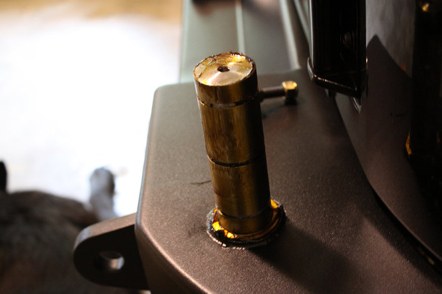 Put one brass washer onto the greased pivot pin, then slide the tire carrier down on top. The second brass washer goes on top.