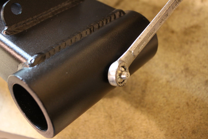 Start preparing the tire carrier by using the 7/16” wrench to install the supplied grease fitting. Also pop the plastic cap into the open tubing end of the carrier.
