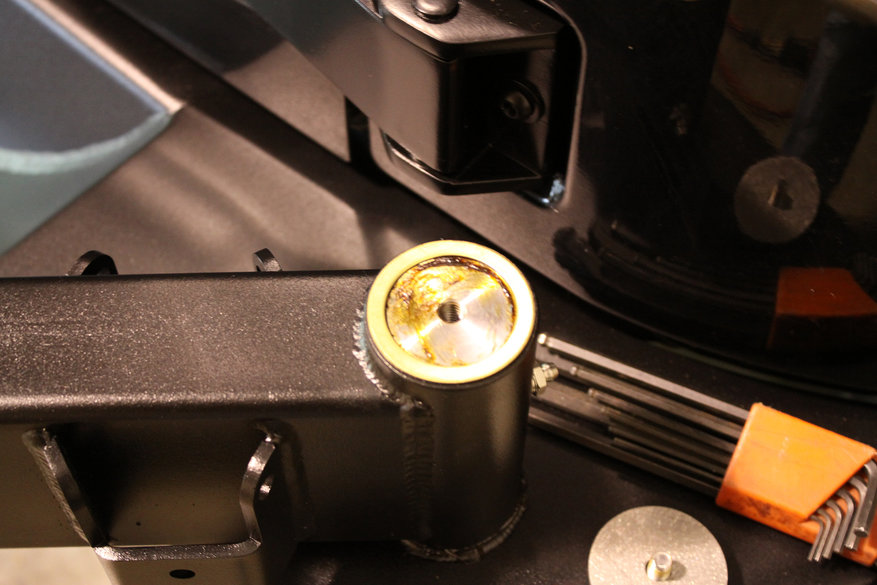 Install the pivot pin with the keyed end facing down and, using the supplied washers (flat and lock), start the grade 8 bolt by hand before fully seating the pin. With it fully seated, there is very little room to start the bolt; so getting it in place without the weight of the carrier fighting you is a great idea. Now, completely cover the pivot pin with waterproof or white lithium grease.
