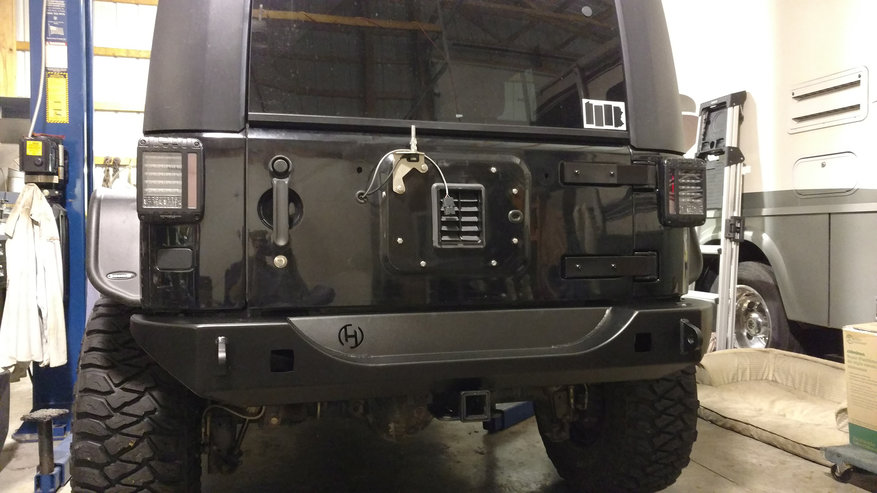 The tire carrier is also compatible with Hyline’s Oversized Spare Tire 3rd Brake Light, which shines through the center hub hole on your spare for a low profile look. It also works with license plate relocation kits that go through the spare, which I have already been using for a while.