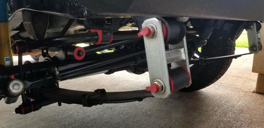 As the shackles twist with the motion of the leaf springs, one arm will sit higher than the other. The bushings help keep this offset equal by allowing slight give under stress. By adding a brace between the shackle arms, this will eliminate the twisting motion of the shackle and force the bushings to absorb more of the suspension load. This will also transfer a higher percentage of the suspension load directly into the frame mount section.