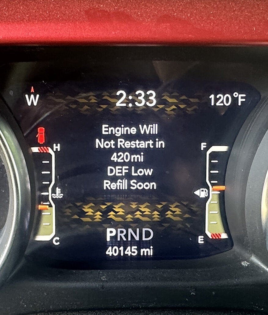 If you continue to ignore DEF levels and keep driving, the Wrangler’s computer starts a countdown sequence. First, you’ll get those alerts and a mileage estimate until DEF runs out. If you still don’t refill, the engine will enter a “limp mode” with reduced power. Finally, once you shut the Jeep off, it may not restart at all until you add DEF.