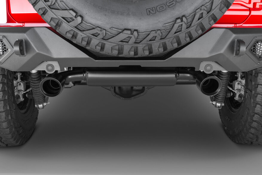 So that's why some aftermarket exhaust systems are offered in high-clearance versions—meaning the exhaust tips are tucked up higher than traditional exits, and the muffler is often relocated closer to the front of the kit. Additionally, these performance mufflers can be smaller in order to prevent damage should the vehicle high-center.