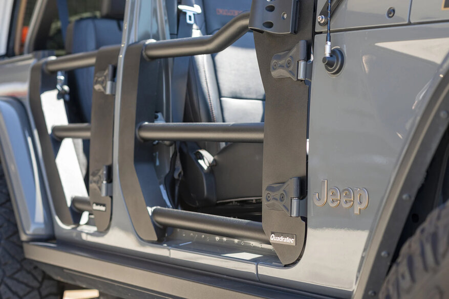 So what are tubular doors? Simple. They are a set of metal tubes that are bent and welded into a frame, and include hinge pins that slide into your door’s body hinges as well as latch mechanisms. That way, installing and using is fairly simple with no cutting, welding, or drilling — such as in our Quadratec Tubular Doors. Some door designs have more tubes than others, and some are angled in different directions for a unique look, but essentially they all give you a door that provides protection between the road and passengers, and a sense of ‘openness’ that goes along with top off driving.
