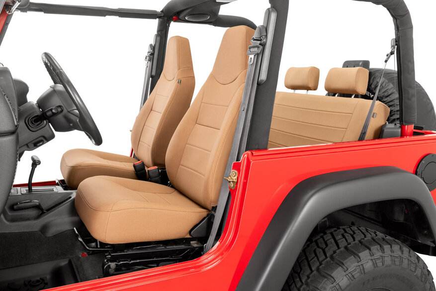 The seating position feels factory but with much better support, and the added bolstering keeps you in place when the ride gets rough. Color options let you match or freshen up your interior without clashing with the Jeep’s factory character, and the stitch work gives just enough flair without being over-the-top.