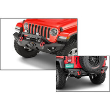 Full-width aftermarket bumpers offer a variety of popular looks such as hoops, stingers and overrider bars that allow you to customize your Jeep's front end and many are no drill applications. These bumpers can also come in a variety of finishes like textured or gloss black, stainless steel, chrome, polished and paintable raw steel. Because these bumpers are significantly stronger than the factory stock bumper, most have an integrated winch mount and can reuse or relocate the factory fog light - or provide extra mounting options for other auxiliary lighting.