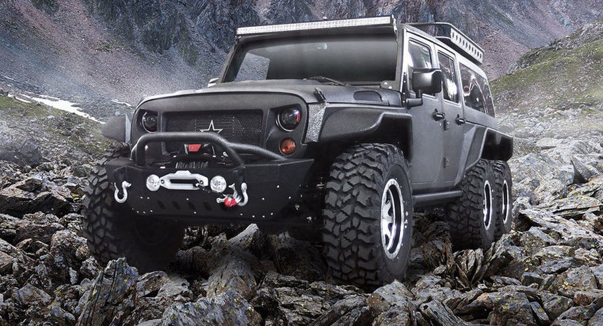 The Tomahawk, from Chinese company G. Patton, is a 6x6 version of the Jeep Wrangler where an extra axle was added to the rear which makes the vehicle look similar to a Mercedes-Benz G63 AMG 6x6.