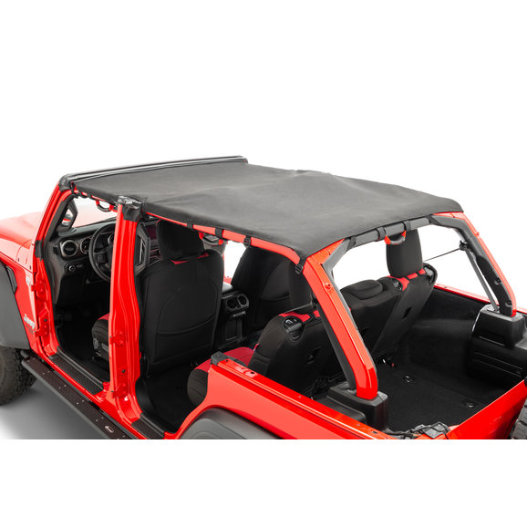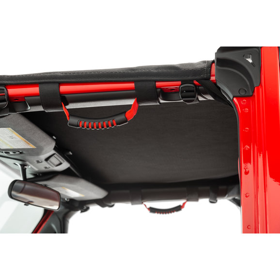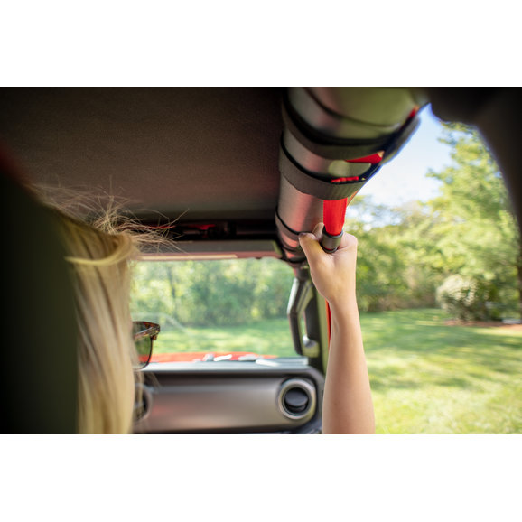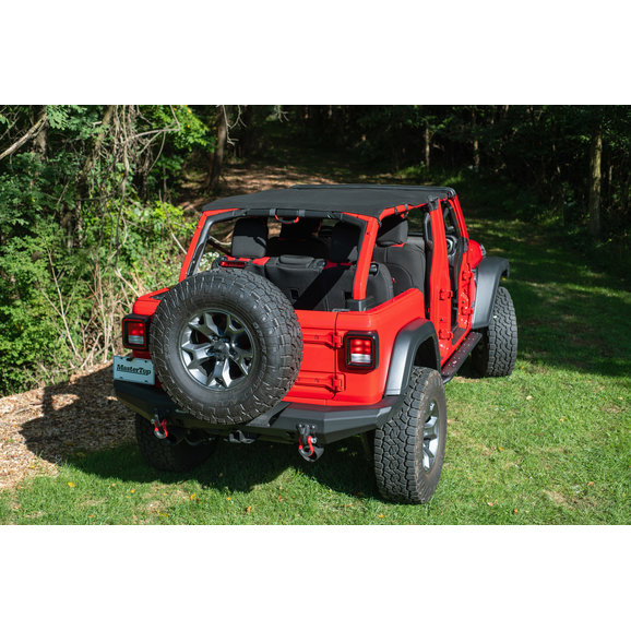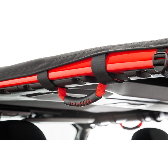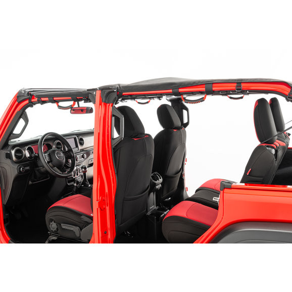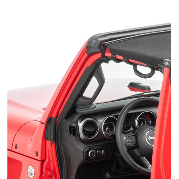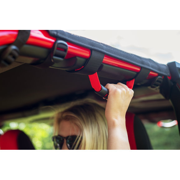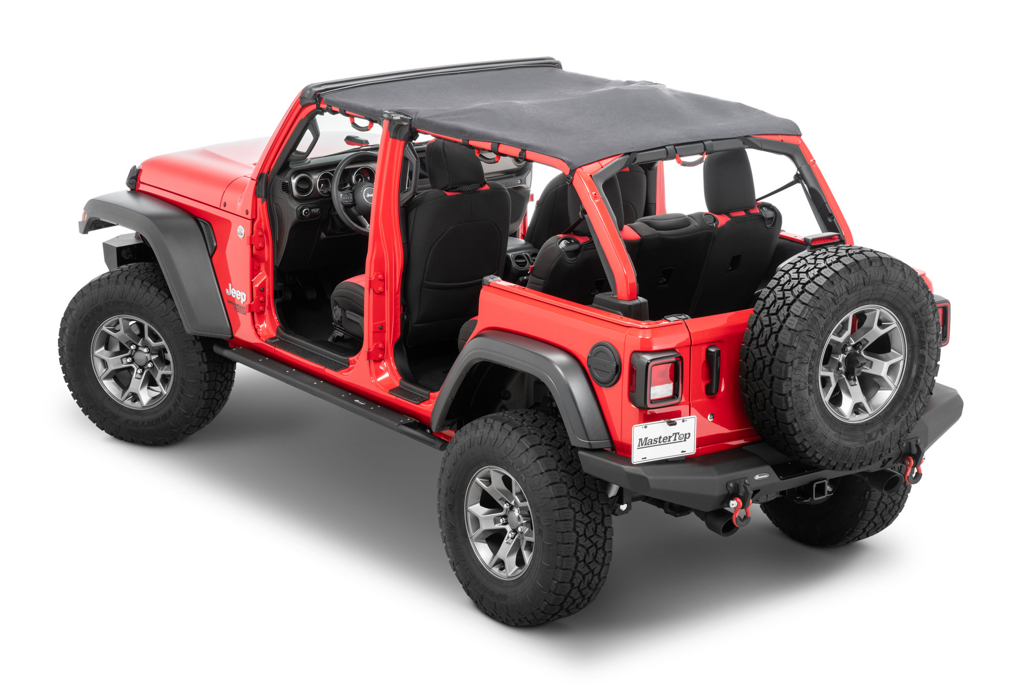 MasterTop innovation at its best! Introducing the new Integrated Grab Handle Summer Bimini Top Plus for Jeep® Wrangler JL Unlimited. These new tops not only protect you from the summer sun but have also built-in grab handles making the entry and exit of your vehicle easy. This patent-pending new design is constructed of durable luxurious 3-layer 30 oz MasterTwill Fabric or durable 25 oz Black Diamond Sail Cloth Fabric with your choice of either red or black webbed grab handles. Each Summer top is a “Bimini plus” design covering both driver and back seat passengers for the ultimate in protection. Since the grab handles are a part of the installation process and installed at the factory, the cost of this top system is less than if you purchased each part individually; Save money, add convenience! Four-door JLU models include 5 Grab Handles including an exclusive rear roll bar handle to help get into the rear of your Jeep. JLU Bimini style tops use MasterTop’s exclusive no windshield header design with a front weather seal.