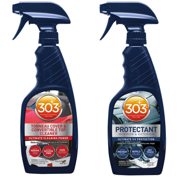 303 Vinyl Convertible Top Care Kit is a protectant kit that restores original color, protects against staining & sun damage, is fast cleaning, removes stubborn stains, and adds years of life to tops & covers. This kit contains both 303 Automotive Tonneau Cover & Convertible Top Cleaner, to help remove stains, dirt, and debris, and 303 Protectant to provide superior protection against harmful UV rays.