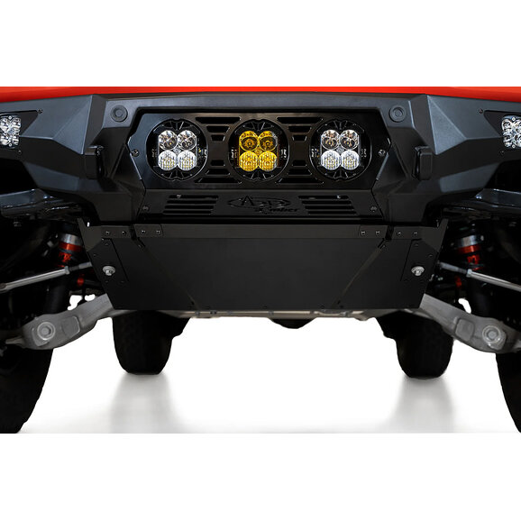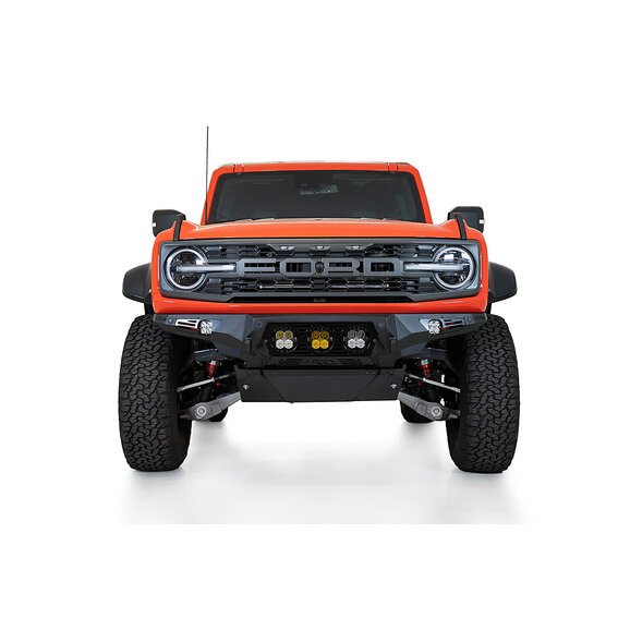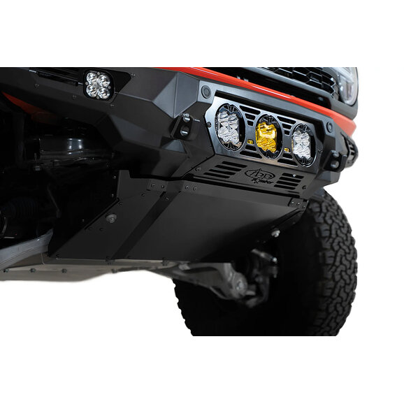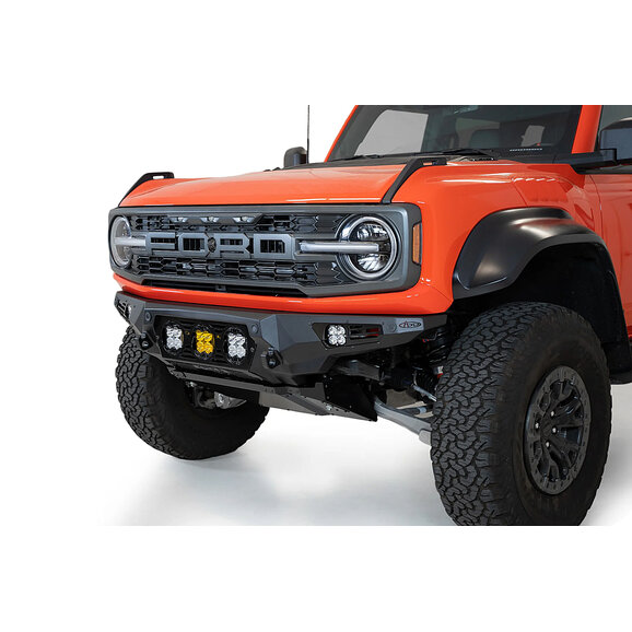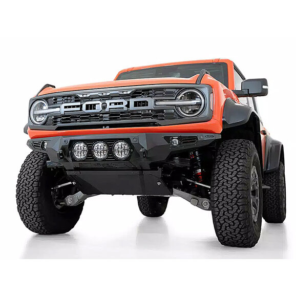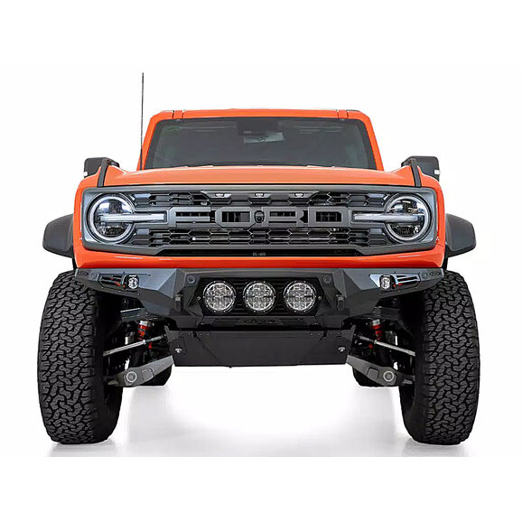 The ADD Offroad Bomber Front Bumper for Ford Bronco Raptor was designed for those seeking an upgrade from their OEM bumper, without sacrificing any of their vehicle’s functionality. The Bomber can truly elevate the look of your Bronco Raptor, with its tight fit and satin black aluminum panels that frame three mounting points for powerful Rigid Industries 360 round lights or Baja Designs lights. Cube-light mounting points are also featured at the sides for added illumination on the trails.